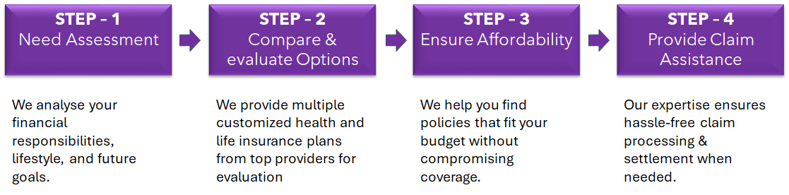 At Mahavir Consultancy helps you to choose the most suitable plan to fulfil your needs. We understand that choosing the right insurance plan can be overwhelming with our FOUR STEPS approach